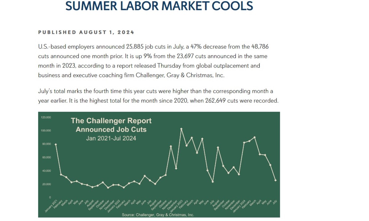 Challenger Gray, meanwhile, noted that job cuts rose for a fourth time this year (on an annual basis) in July, taking the year-to-date total to 460,530. That's down 4.4% from last year, but overall hiring is running at the slowest pace since 2012, the report noted.