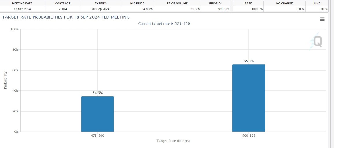 CME Group's FedWatch continues to put the chances of a 50 basis point cut next month at around 26.5%. Those odds will surely move quickly when Powell begins to speak, and they suggest that investors are betting on at least a full percentage point of reductions between now and year's end.