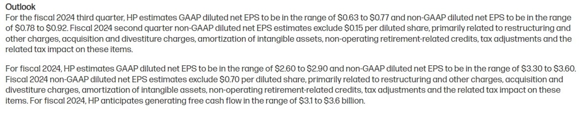 HP said it sees fiscal 2024 earnings in the region of $3.30 to $3.60 per share, a five cent bump from its prior forecast, after it reported a 3% climb in notebook and desktop computer sales for the three months ending in April. AI-powered models, HP said, will add even more heft to second-half revenues.