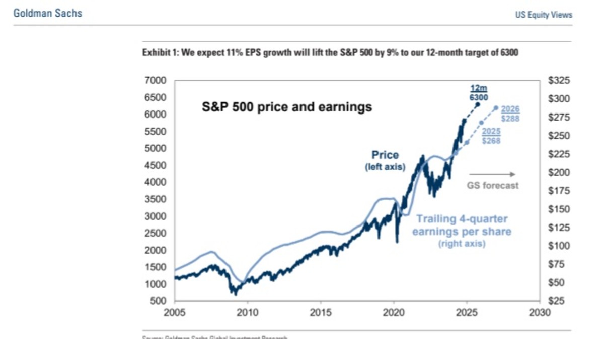 Goldman Sachs reiterated its 12-month price target for the S&P 500, which sees the benchmark rising to around 6,300 points, thanks in part to an improving earnings story and a supportive Federal Reserve.