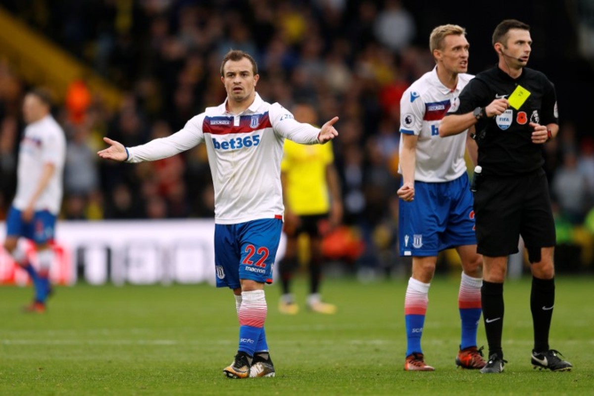 Soccer Football - Premier League - Watford vs Stoke City - Vicarage Road, Watford, Britain - October 28, 2017 Stoke City's Charlie Adam in action with Watford's Heurelho Gomes REUTERS/Peter Nicholls Soccer Football - Premier League - Watford vs Stoke City - Vicarage Road, Watford, Britain - October 28, 2017 Stoke City's Eric Maxim Choupo-Moting is shown a yellow card by referee Robert Madley as Darren Fletcher looks on REUTERS/Peter Nicholls Soccer Football - Premier League - Watford vs Stoke City - Vicarage Road, Watford, Britain - October 28, 2017 Stoke City's Xherdan Shaqiri looks dejected after he was shown a yellow card by referee MIchael Oliver REUTERS/Peter Nicholls Soccer Football - Premier League - Watford vs Stoke City - Vicarage Road, Watford, Britain - October 28, 2017 Stoke City's Jack Butland in action Action Images via Reuters/Tony O'Brien Soccer Football - Premier League - Watford vs Stoke City - Vicarage Road, Watford, Britain - October 28, 2017 Stoke City's Ryan Shawcross and Watford's Jose Holebas clash Action Images via Reuters/Tony O'Brien Soccer Football - Premier League - Watford vs Stoke City - Vicarage Road, Watford, Britain - October 28, 2017 Stoke City's Darren Fletcher and Mame Biram Diouf clash with Watford's Jose Holebas REUTERS/Peter Nicholls Soccer Football - Premier League - Watford vs Stoke City - Vicarage Road, Watford, Britain - October 28, 2017 Stoke City manager Mark Hughes celebrates after the match REUTERS/Peter Nicholls