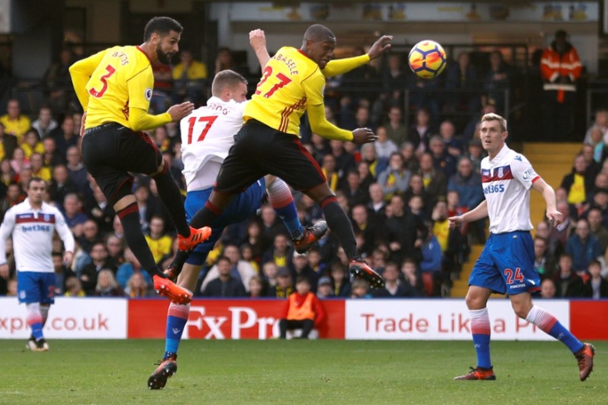 Soccer Football - Premier League - Watford vs Stoke City - Vicarage Road, Watford, Britain - October 28, 2017 Stoke City's Ryan Shawcross in action with Watford's Christian Kabasele and Miguel Angel Britos REUTERS/Peter Nicholls