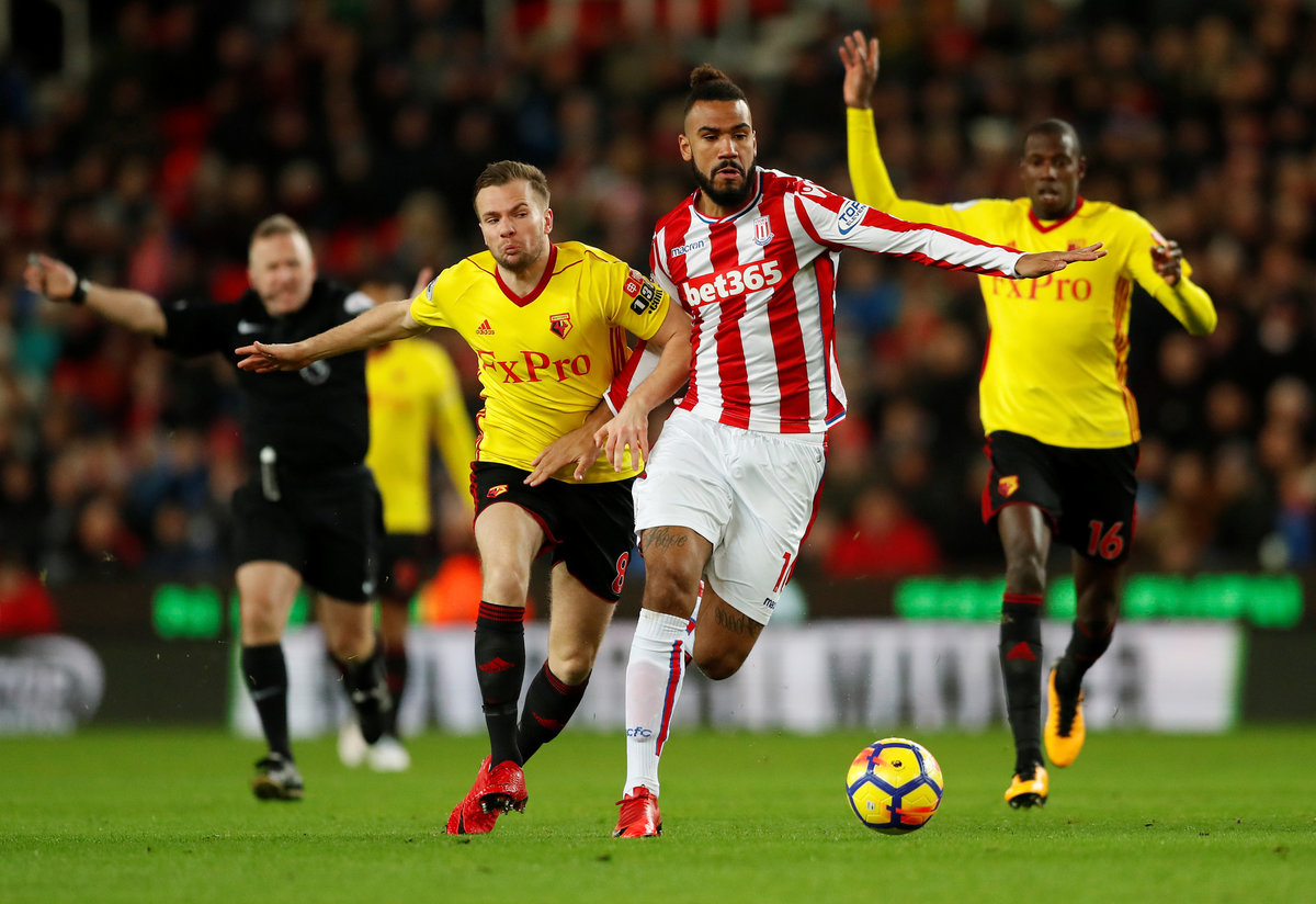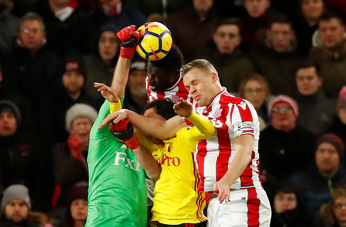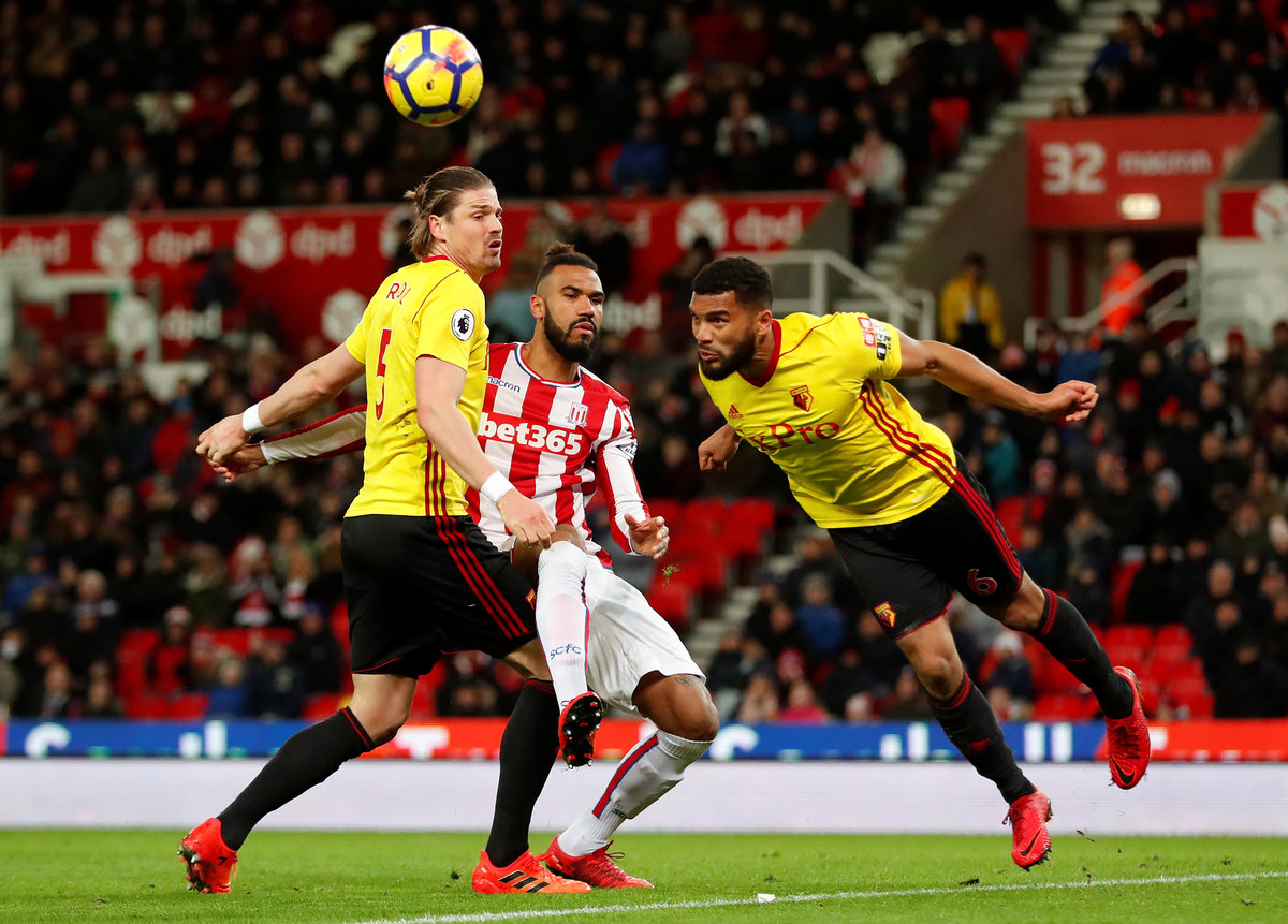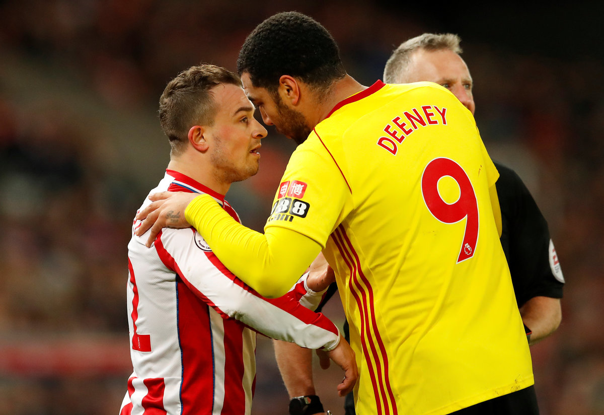 Soccer Football - Premier League - Stoke City vs Watford - bet365 Stadium, Stoke-on-Trent, Britain - January 31, 2018 Watford's Orestis Karnezis in action with Stoke City's Ryan Shawcross Action Images via Reuters/Andrew BoyersSoccer Football - Premier League - Stoke City vs Watford - bet365 Stadium, Stoke-on-Trent, Britain - January 31, 2018 Watford's Gerard Deulofeu REUTERS/Peter PowellSoccer Football - Premier League - Stoke City vs Watford - bet365 Stadium, Stoke-on-Trent, Britain - January 31, 2018 Watford's Gerard Deulofeu in action with Stoke City's Eric Maxim Choupo-Moting Action Images via Reuters/Andrew Boyers Soccer Football - Premier League - Stoke City vs Watford - bet365 Stadium, Stoke-on-Trent, Britain - January 31, 2018 Stoke City's Xherdan Shaqiri and Watford's Troy Deeney Action Images via Reuters/Andrew Boyers Soccer Football - Premier League - Stoke City vs Watford - bet365 Stadium, Stoke-on-Trent, Britain - January 31, 2018 Stoke City's Xherdan Shaqiri holds his face Action Images via Reuters/Andrew Boyers Soccer Football - Premier League - Stoke City vs Watford - bet365 Stadium, Stoke-on-Trent, Britain - January 31, 2018 Watford's Christian Kabasele is shown a yellow card by referee Jonathan Moss Action Images via Reuters/Andrew Boyers Soccer Football - Premier League - Stoke City vs Watford - bet365 Stadium, Stoke-on-Trent, Britain - January 31, 2018 Watford's Adrian Mariappa and Sebastian Prodl in action with Stoke City's Eric Maxim Choupo-Moting Action Images via Reuters/Andrew Boyers