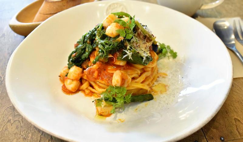 I ordered the pomodoro pasta, which uses fresh seasonal vegetables. What was served looked beautiful with its vivid contrast of three colors: green leafy vegetables, red tomato sauce and white balls of cheese. The pasta had a springy, chewy texture, which went well with the sauce that boasted the flavors of tomatoes and onions, as well as rich cheese.