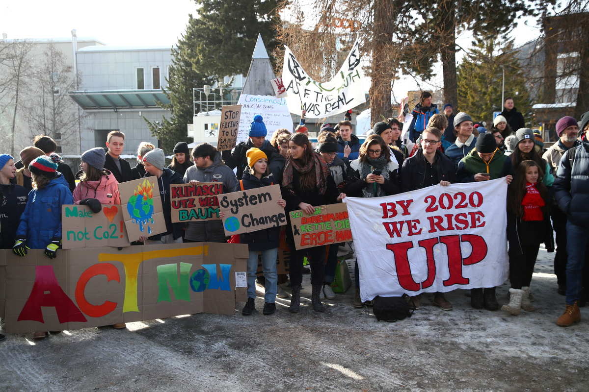 People gather to take part in a climate strike protest during the 50th World Economic Forum (WEF) annual meeting in Davos, Switzerland, January 24, 2020. REUTERS/Denis Balibouse