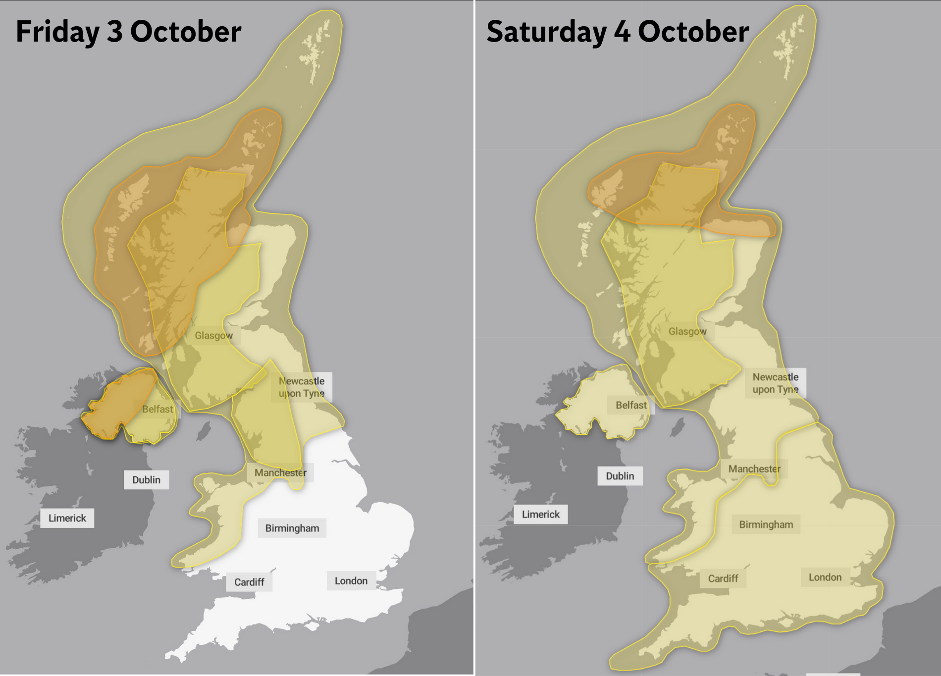 There are now three amber warnings in place across Friday and Saturday, where a danger to live is posed. These are in western Northern Ireland and Scotland on Friday, and only northern Scotland on Saturday.