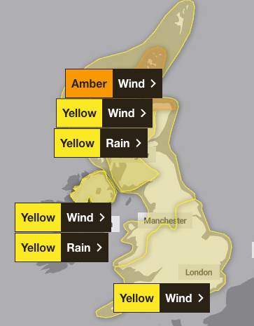 This covers most of Wales, as well and the Midlands, east and south of England. Yellow warnings for wind and rain are in place for the rest of the UK at the same time.