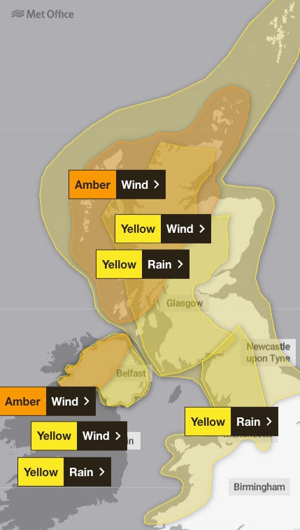 The north of Scotland was covered by an amber warning for wind until 9pm on Saturday with yellow warnings covering the whole of Scotland, the north of England and north Wales until the end of the day. A further yellow warning for wind runs until 7pm in the rest of England and Wales.
