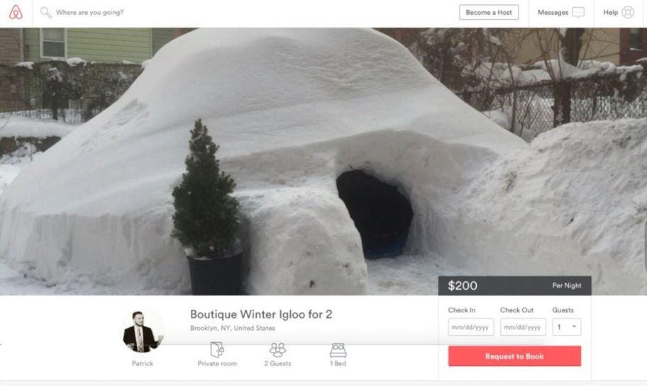 An enterprising New Yorker took advantage of the blizzard ravaging the city by building an igloo and listing it on Airbnb.