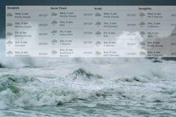 Downpours and waves up to four metres are expected in the Gulf of Thailand from Thursday, beginning with Surat Thani, Nakhon Si Thammarat, Phatthalung, Songkhla, Yala, Pattani, Narathiwat, Krabi, Trang and Satun. Other provinces in the southern region are set for heavy rain from Friday.