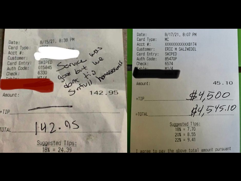 Salzwedel posted a photo of the note which was scrawled on the bill for their meal. It read: “Service was good but we don’t tip sinfull [sic] homosexuals.”