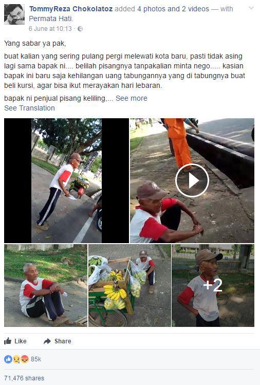 Online donations have poured in for an elderly Indonesian banana seller who was robbed of his life savings.