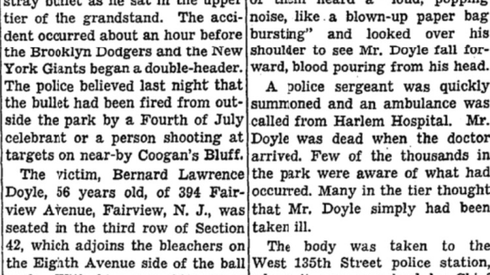 Most fans didn’t notice that Doyle had been shot, although one spectator reported hearing a “loud popping noise, like a blown-up paper bag bursting,” according to a front page story in The New York Times.