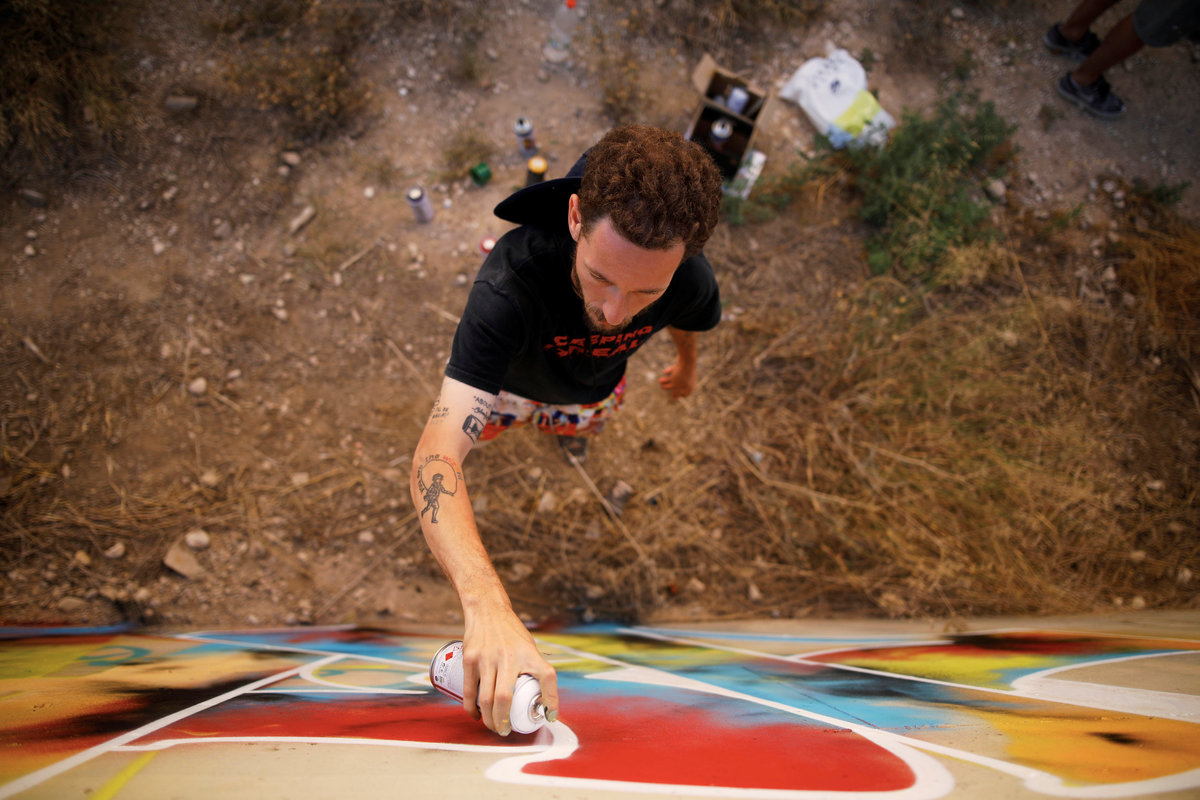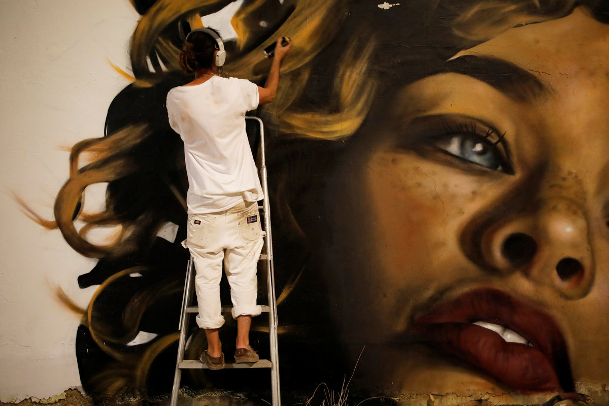 Israeli artist who goes by the name Klone, works on his wall painting during an art happening, called POW! WOW! Israel, which is connected to a week-long art and culture festival held in Hawaii called POW! WOW! Hawaii, in the southern city of Arad, Israel June 5, 2017. Picture taken June 5, 2017. REUTERS/Amir Cohen