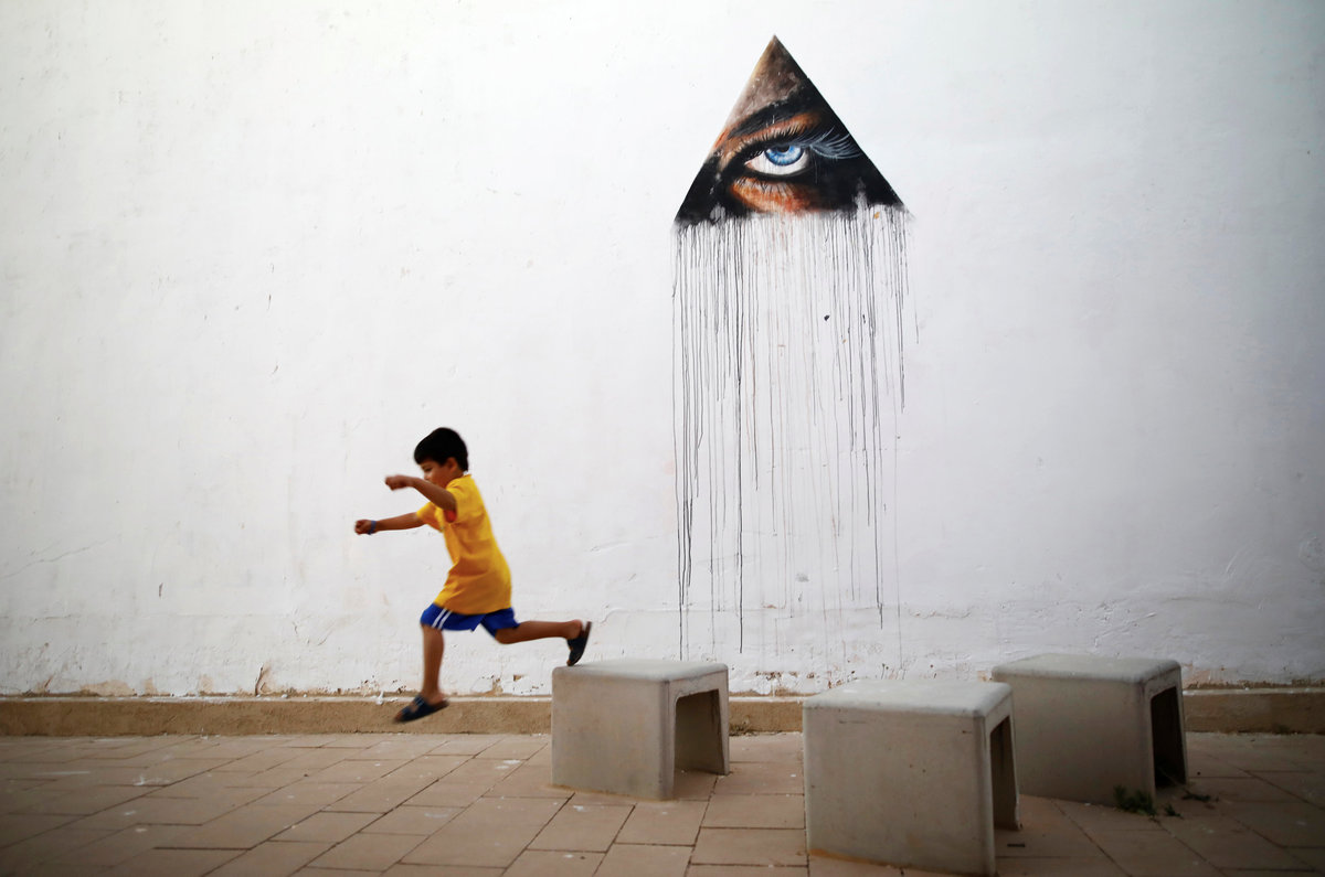A boy plays in front of a wall painting by Hawaiian artist Kamea Hadar during an art happening, called POW! WOW! Israel, which is connected to a week-long art and culture festival held in Hawaii called POW! WOW! Hawaii, in the southern city of Arad, Israel June 6, 2017. Picture taken June 6, 2017. REUTERS/Amir Cohen