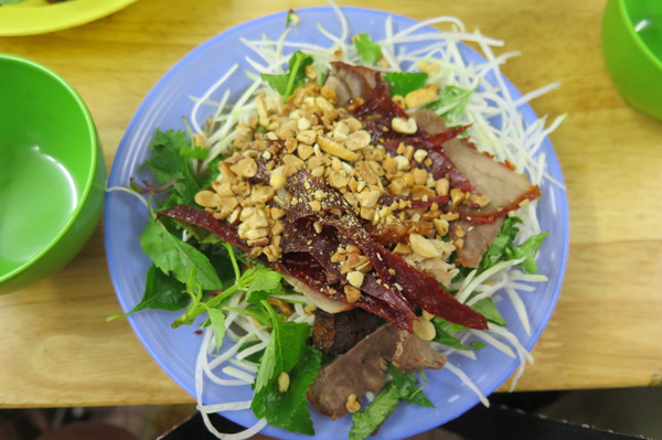 Next, we made our way to a place serving papaya and beef salad. A bit different from other papaya salads in the region, this one was light on spice and big on crunch thanks to the peanuts.