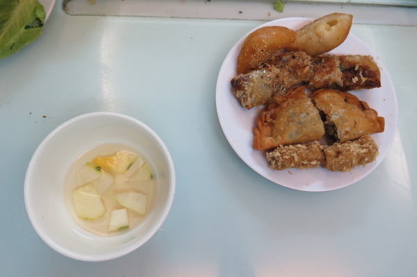 Here is where stomach-space rationing began. After just three stops, we were all stuffed. And next on the list? A plate with four different fried foods, including the sweet doughnuts that vendors sell on the street.