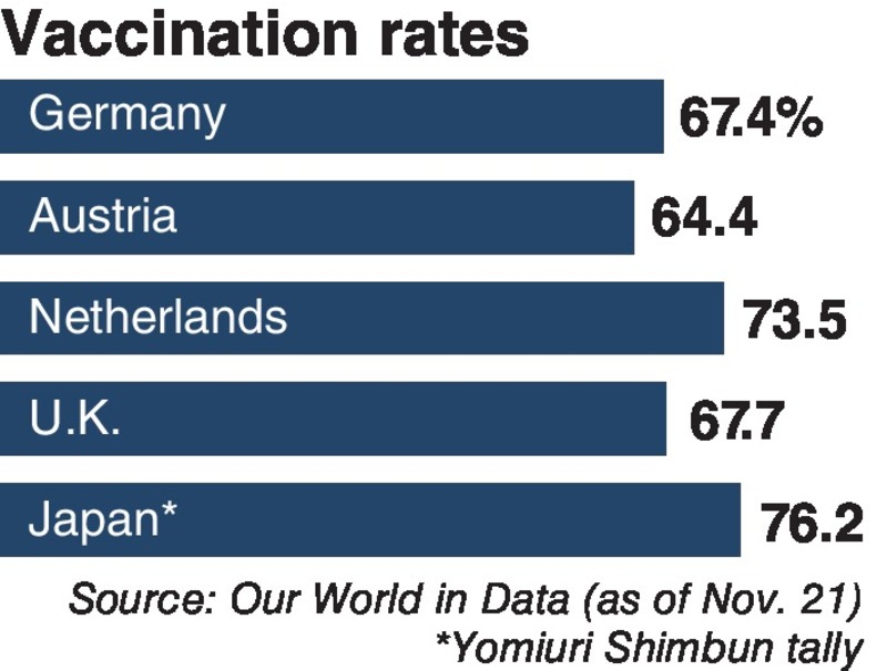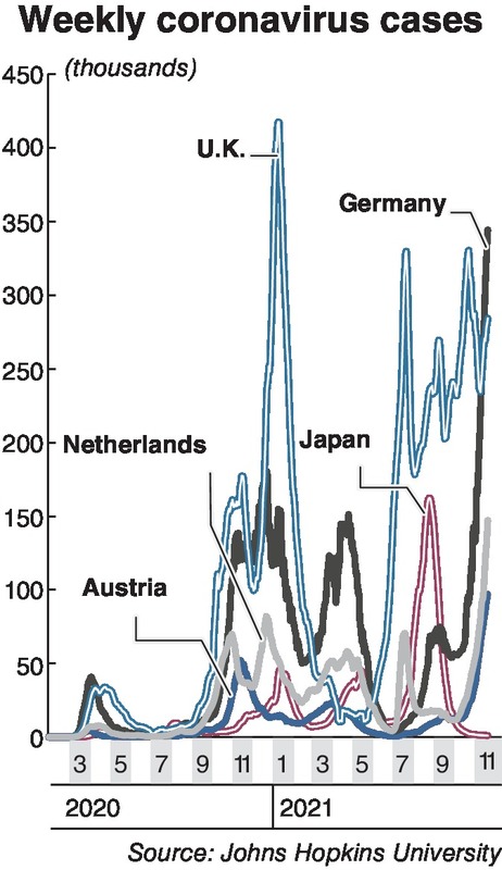 BERLIN/GENEVA -- COVID-19 cases are surging in Germany and other European countries, with experts citing a combination of factors, including the hasty relaxation of restrictions and plateaued vaccination rates. The rebound has prompted some countries to implement new pandemic measures such as stricter restrictions for unvaccinated people.