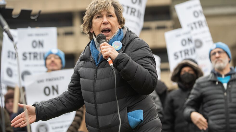 By noon, several hundred union members gathered at the quad for a rally with officials, including mayoral candidate and Cook County Commissioner Brandon Johnson, Chicago Teachers Union President Stacy Davis Gates, state Rep. Lakesia Collins, American Federation of Teachers President Randi Weingarten and Ald. Byron Sigcho-Lopez (25th).