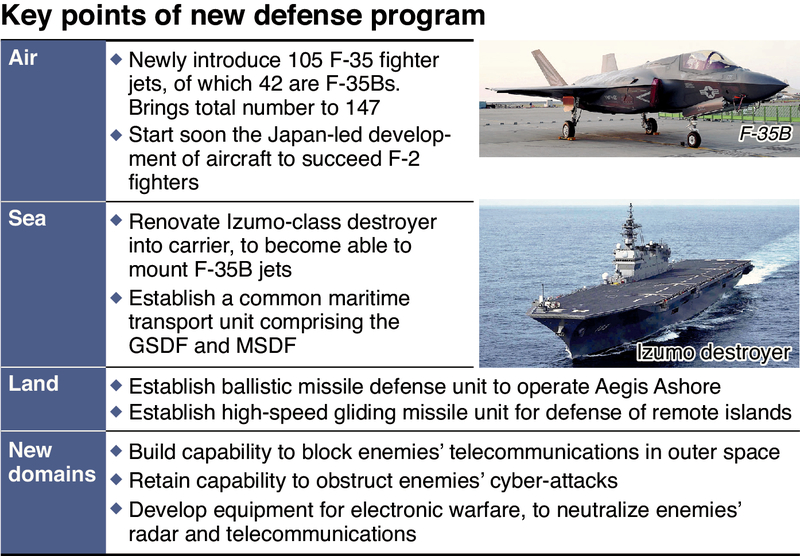 The government adopted revised National Defense Program Guidelines and the Mid-Term Defense Program (fiscal 2019-fiscal 2023) on Tuesday, stipulating the introduction of top-of-the-line F-35B stealth fighter jets, with the Maritime Self-Defense Force's Izumo-class destroyer to be effectively used as an aircraft carrier.