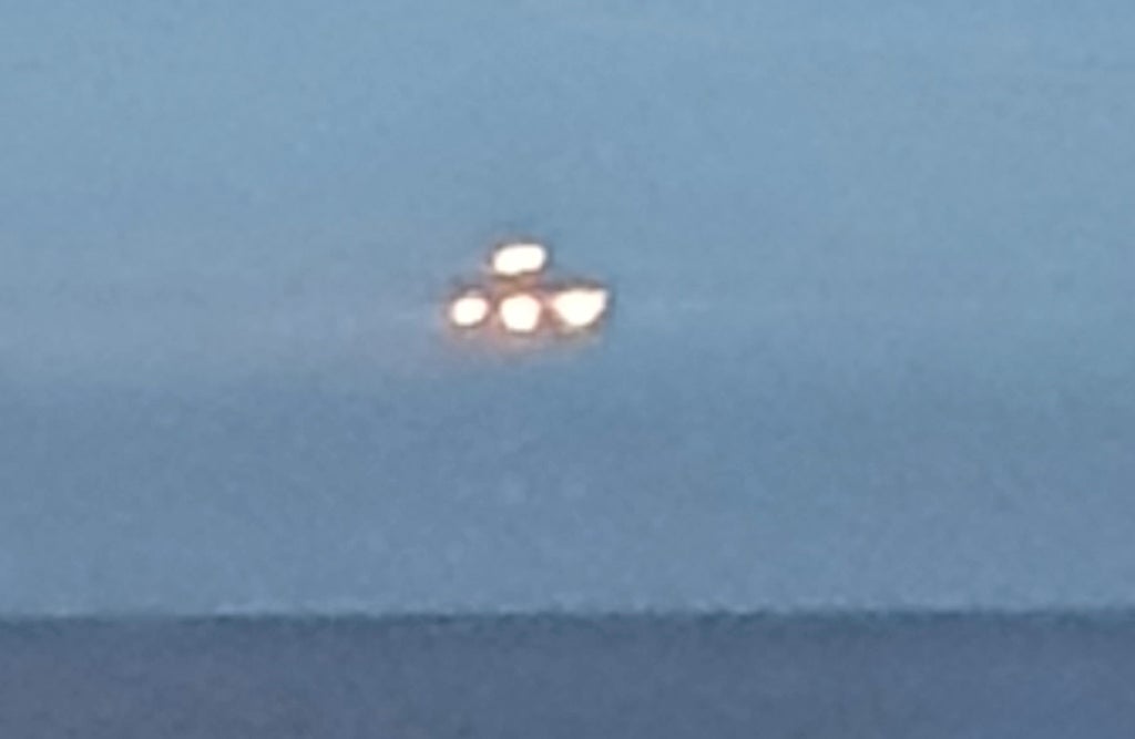The strange object with four bright lights in a triangular-shaped formation was captured lingering in the sky by Matthew Evans, who said he was looking outside the sea-facing window of his top-floor flat last week in Teignmouth, Devon when he noticed the object.