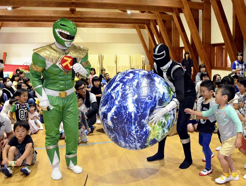 The scene occurred at a municipal nursery school in the town of Yazu, Tottori Prefecture, in mid-June. Under the name Eco Sentai Sunabazu, the green-suited hero visits kindergartens and nursery schools and battles a villainous CO2 character to save the Earth, educating children along the way about ways to prevent global warming.