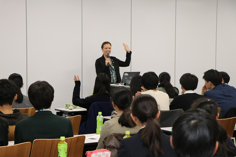 The 45-minute lecture was conducted entirely in English with no interpretation. Students actively participated in the subsequent 35-minute discussion session with the three officials.