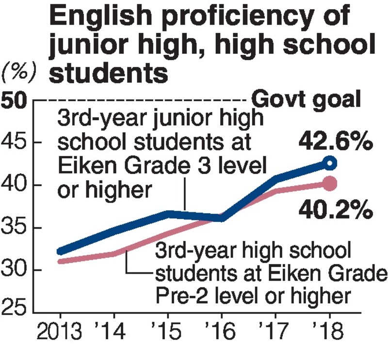 About 40 percent of junior high and high school students across the nation had reached recommended levels for their English proficiency in the 2018 academic year, well below the government target of 50 percent, according to the education ministry.