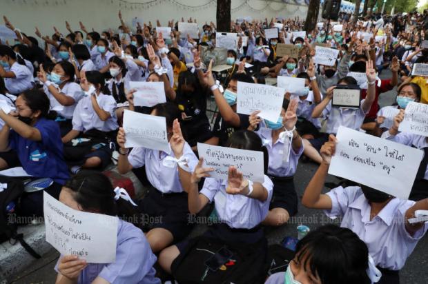 The young protesters in student uniforms, many wearing white ribbons, urged Prime Minister Prayut Chan-o-cha and Education Minister Nataphol Teepsuwan to step down and called for reform in schools.