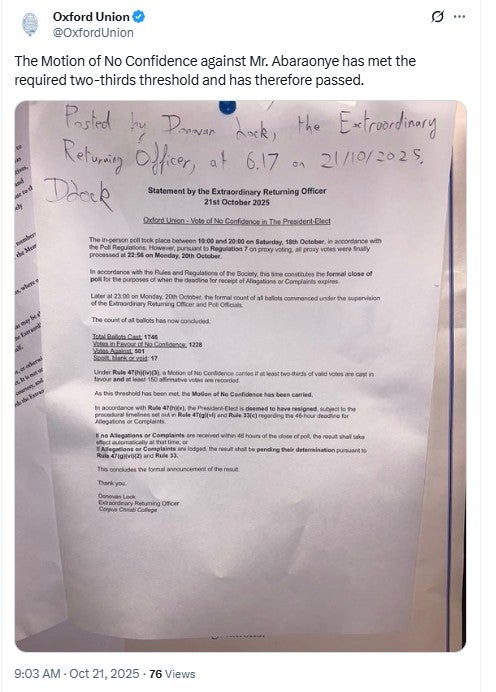 A vote of no confidence against incoming Oxford Union president George Abaraonye has passed, the institution confirmed on Tuesday morning. The motion secured the required two-thirds majority, despite claims that the poll itself was compromised.