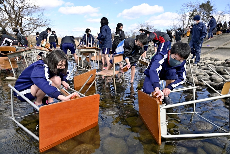 About 200 third-year students of Inuyama Junior High School in Inuyama, Aichi Prefecture, washed their homeroom desks and chairs in the nearby Kiso River on Monday, a school tradition that dates back to 1949.