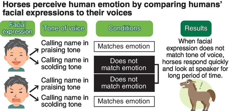 The team said its experiment showed that a horse responds more quickly to a human voice when the speaker's tone does not match the facial expression that the horse sees. It was the first time that an animal other than dogs has been confirmed to have such a capability.