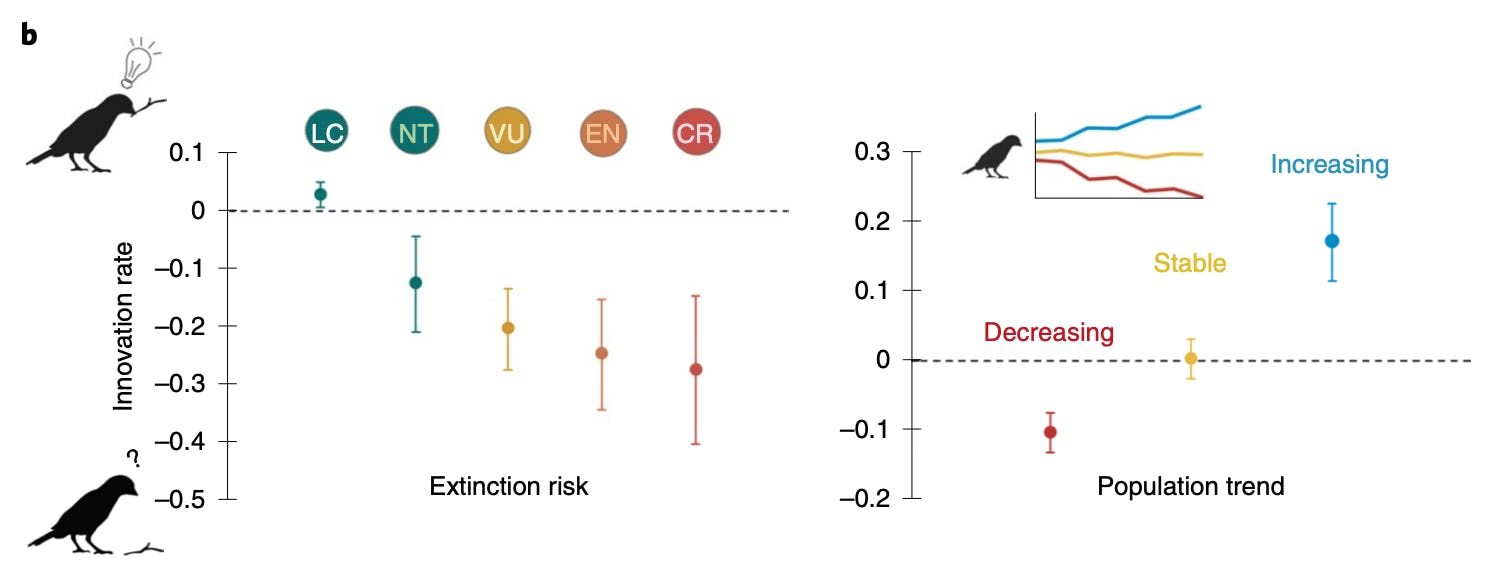 Abstract: Behavioural plasticity is believed to reduce species vulnerability to extinction, yet global evidence supporting this hypothesis is lacking. We address this gap by quantifying the extent to which birds are observed behaving in novel ways to obtain food in the wild; based on a unique dataset of >3,800 novel behaviours, we show that species with a higher propensity to innovate are at a lower risk of global extinction and are more likely to have increasing or stable populations than less innovative birds. These results mainly reflect a higher tolerance of innovative species to habitat destruction, the main threat for birds.