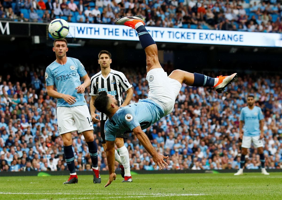 Soccer Football - Premier League - Manchester City v Newcastle United - Etihad Stadium, Manchester, Britain - September 1, 2018 Manchester City's Sergio Aguero shoots at goal with an overhead kick before a goal is disallowed Action Images via Reuters/Jason Cairnduff