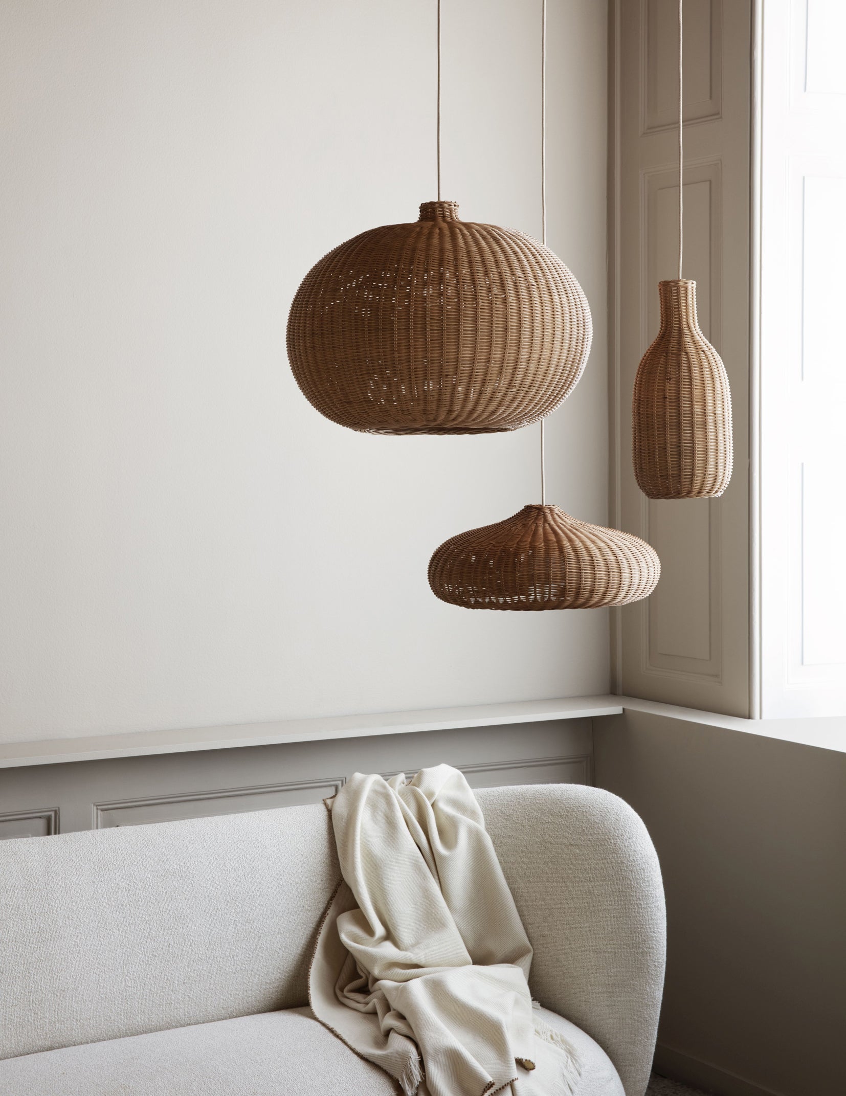 Natural Braided Rattan Lampshades – Low, Belly or Bottle, £90 each, Kagu Interiors
