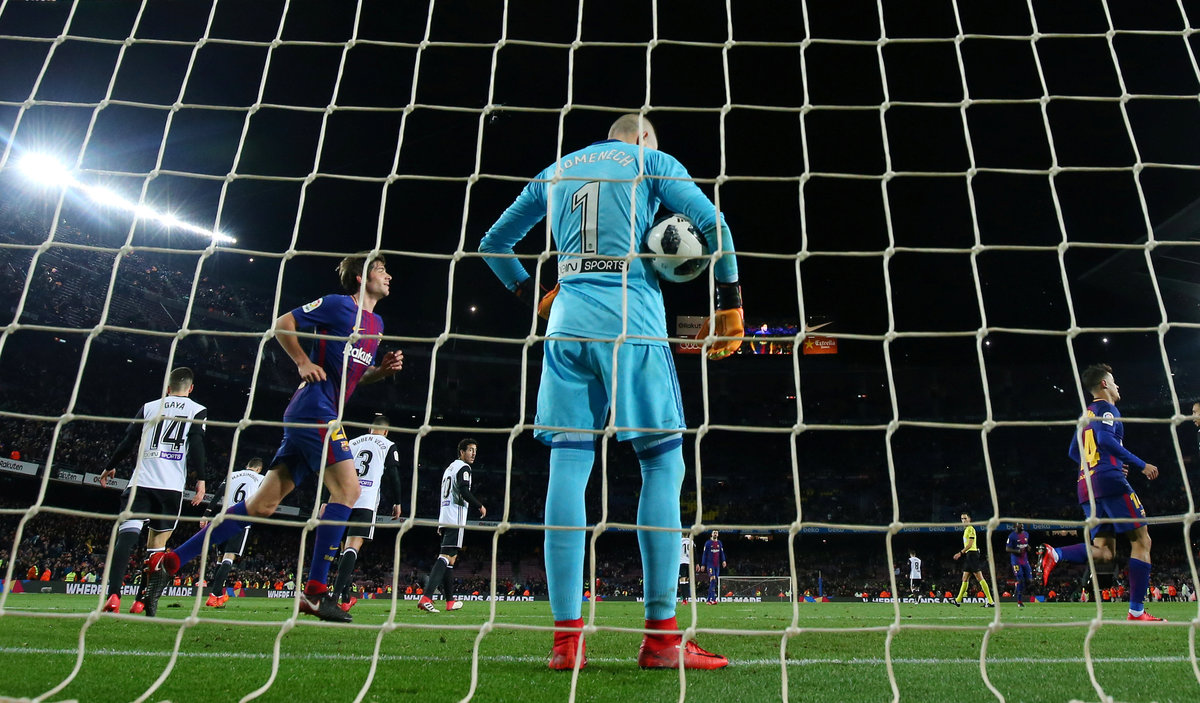 Soccer Football - Spanish King's Cup Semi Final First Leg - FC Barcelona vs Valencia - Camp Nou, Barcelona, Spain - February 1, 2018 Valencia's Jaume Domenech looks dejected after Barcelona’s Luis Suarez scored their first goal REUTERS/Albert Gea