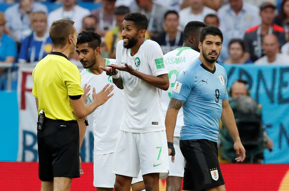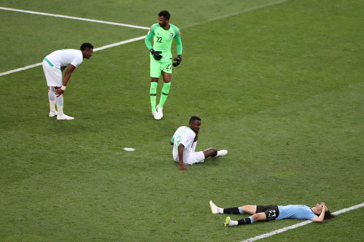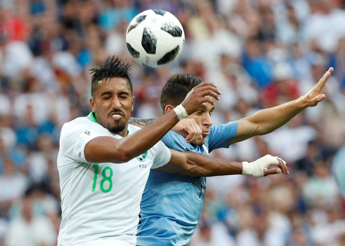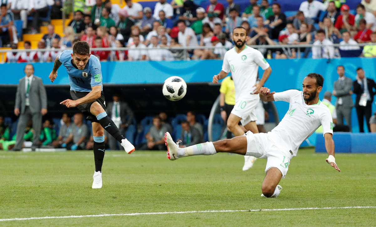 Soccer Football - World Cup - Group A - Uruguay vs Saudi Arabia - Rostov Arena, Rostov-on-Don, Russia - June 20, 2018 Uruguay's Lucas Torreira shoots at goal under pressure from Saudi Arabia's Abdullah Otayf REUTERS/Max RossiSoccer Football - World Cup - Group A - Uruguay vs Saudi Arabia - Rostov Arena, Rostov-on-Don, Russia - June 20, 2018 Saudi Arabia's Salem Al-Dawsari in action with Uruguay's Lucas Torreira REUTERS/Max RossiSoccer Football - World Cup - Group A - Uruguay vs Saudi Arabia - Rostov Arena, Rostov-on-Don, Russia - June 20, 2018 Uruguay's Carlos Sanchez reacts REUTERS/Marko DjuricaSoccer Football - World Cup - Group A - Uruguay vs Saudi Arabia - Rostov Arena, Rostov-on-Don, Russia - June 20, 2018 Uruguay's Carlos Sanchez misses a chance to score REUTERS/Marcos BrindicciSoccer Football - World Cup - Group A - Uruguay vs Saudi Arabia - Rostov Arena, Rostov-on-Don, Russia - June 20, 2018 Uruguay's Diego Laxalt in action with Saudi Arabia's Osama Hawsawi REUTERS/Max RossiSoccer Football - World Cup - Group A - Uruguay vs Saudi Arabia - Rostov Arena, Rostov-on-Don, Russia - June 20, 2018 Saudi Arabia coach Juan Antonio Pizzi REUTERS/Marcos BrindicciSoccer Football - World Cup - Group A - Uruguay vs Saudi Arabia - Rostov Arena, Rostov-on-Don, Russia - June 20, 2018 Saudi Arabia's Mohammed Al-Owais makes a save REUTERS/Carlos Garcia RawlinsSoccer Football - World Cup - Group A - Uruguay vs Saudi Arabia - Rostov Arena, Rostov-on-Don, Russia - June 20, 2018 Saudi Arabia's Salman Al-Faraj talks to referee Clement Turpin REUTERS/Carlos Garcia RawlinsSoccer Football - World Cup - Group A - Uruguay vs Saudi Arabia - Rostov Arena, Rostov-on-Don, Russia - June 20, 2018 Uruguay's Luis Suarez clashes with Saudi Arabia's Ali Al-Bulaihi after a challenge REUTERS/Carlos Garcia Rawlins