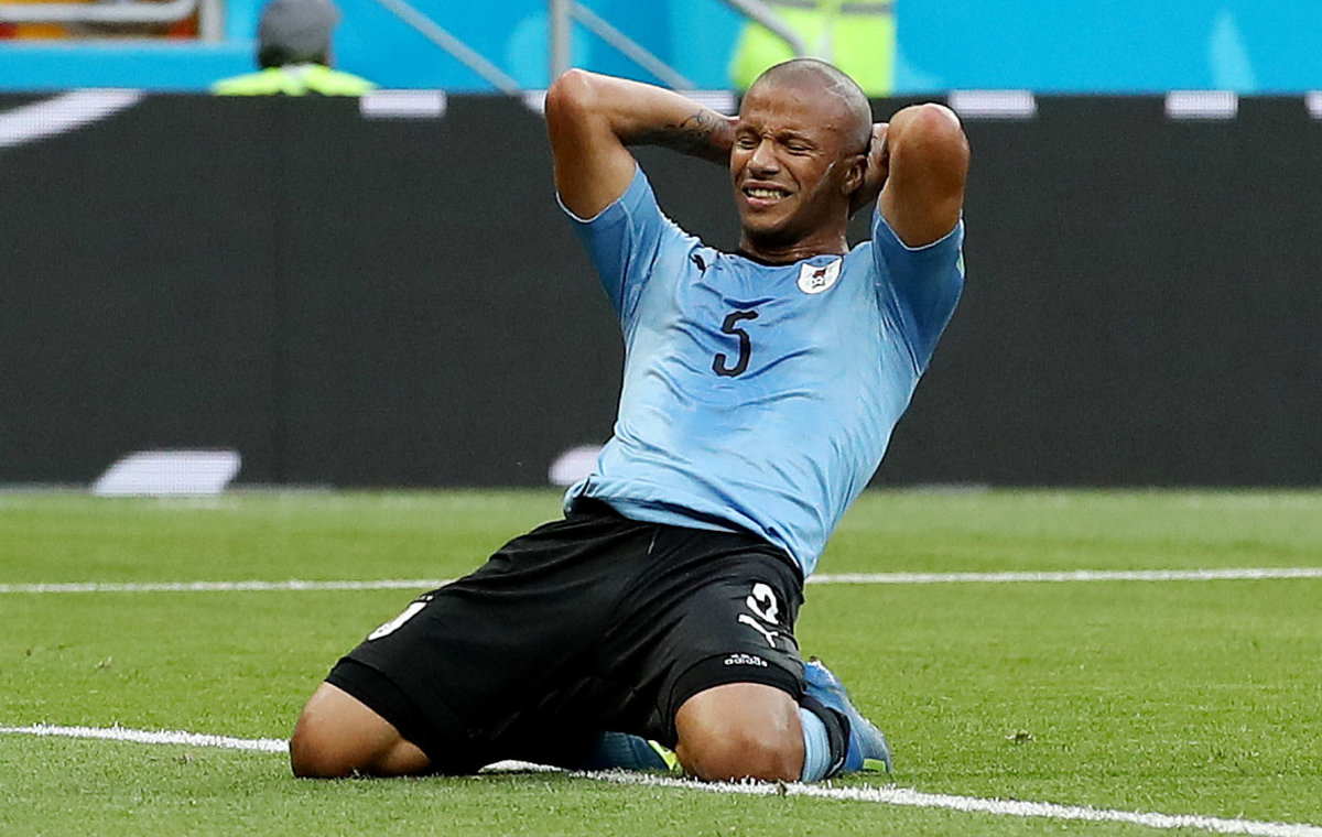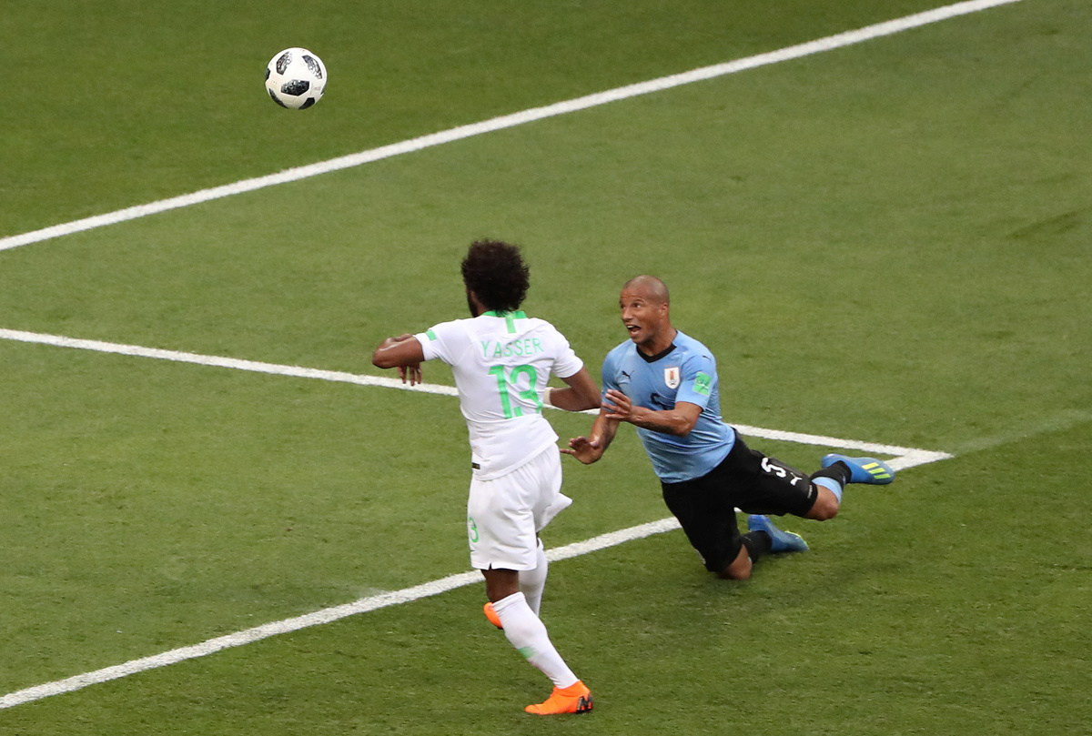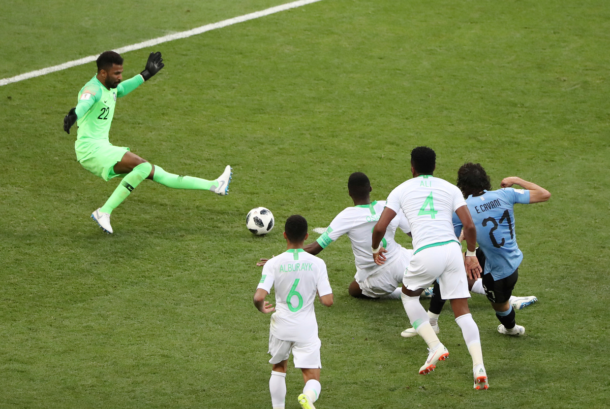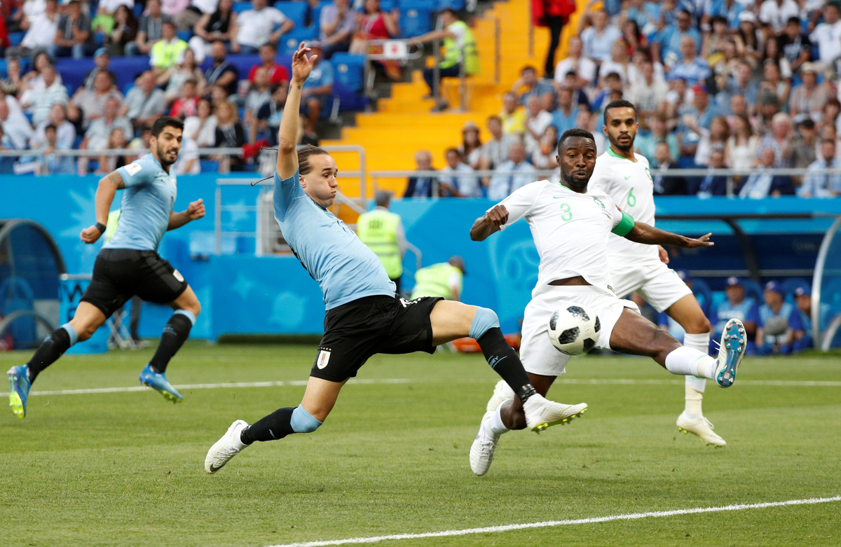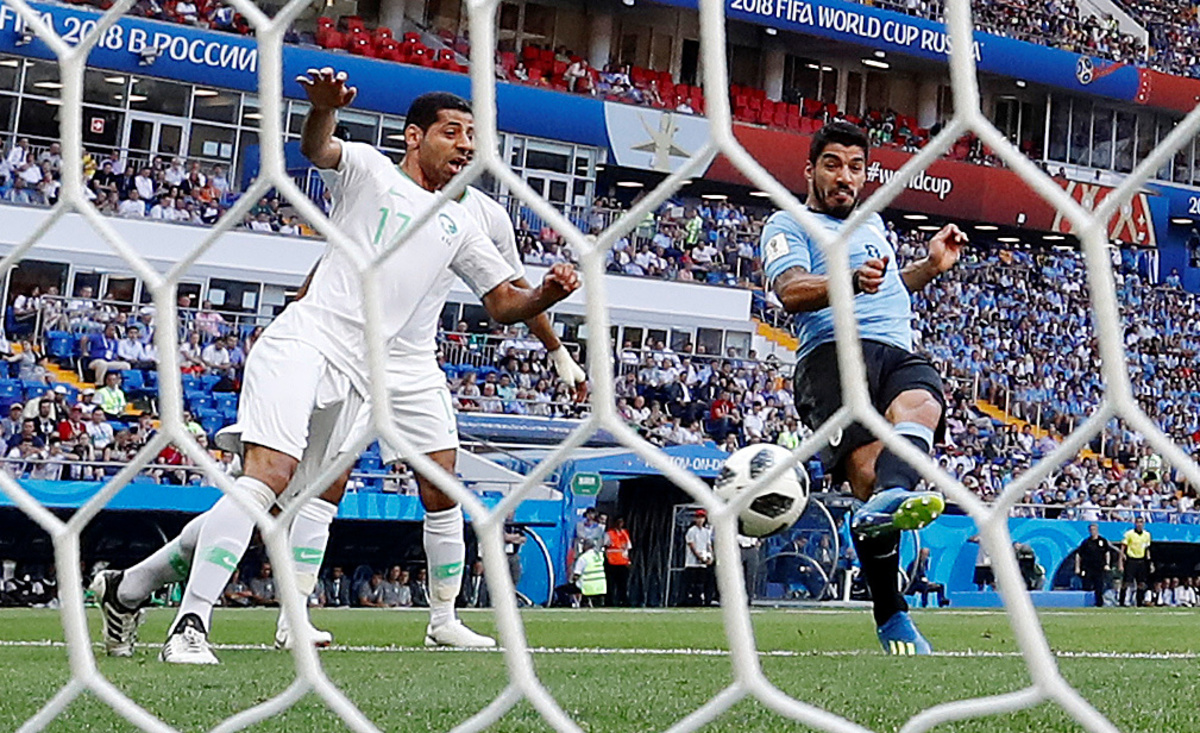 Soccer Football - World Cup - Group A - Uruguay vs Saudi Arabia - Rostov Arena, Rostov-on-Don, Russia - June 20, 2018 Uruguay's Lucas Torreira shoots at goal under pressure from Saudi Arabia's Abdullah Otayf REUTERS/Max RossiSoccer Football - World Cup - Group A - Uruguay vs Saudi Arabia - Rostov Arena, Rostov-on-Don, Russia - June 20, 2018 Saudi Arabia's Salem Al-Dawsari in action with Uruguay's Lucas Torreira REUTERS/Max RossiSoccer Football - World Cup - Group A - Uruguay vs Saudi Arabia - Rostov Arena, Rostov-on-Don, Russia - June 20, 2018 Uruguay's Carlos Sanchez reacts REUTERS/Marko DjuricaSoccer Football - World Cup - Group A - Uruguay vs Saudi Arabia - Rostov Arena, Rostov-on-Don, Russia - June 20, 2018 Uruguay's Carlos Sanchez misses a chance to score REUTERS/Marcos BrindicciSoccer Football - World Cup - Group A - Uruguay vs Saudi Arabia - Rostov Arena, Rostov-on-Don, Russia - June 20, 2018 Uruguay's Diego Laxalt in action with Saudi Arabia's Osama Hawsawi REUTERS/Max RossiSoccer Football - World Cup - Group A - Uruguay vs Saudi Arabia - Rostov Arena, Rostov-on-Don, Russia - June 20, 2018 Saudi Arabia coach Juan Antonio Pizzi REUTERS/Marcos BrindicciSoccer Football - World Cup - Group A - Uruguay vs Saudi Arabia - Rostov Arena, Rostov-on-Don, Russia - June 20, 2018 Saudi Arabia's Mohammed Al-Owais makes a save REUTERS/Carlos Garcia RawlinsSoccer Football - World Cup - Group A - Uruguay vs Saudi Arabia - Rostov Arena, Rostov-on-Don, Russia - June 20, 2018 Saudi Arabia's Salman Al-Faraj talks to referee Clement Turpin REUTERS/Carlos Garcia RawlinsSoccer Football - World Cup - Group A - Uruguay vs Saudi Arabia - Rostov Arena, Rostov-on-Don, Russia - June 20, 2018 Uruguay's Luis Suarez clashes with Saudi Arabia's Ali Al-Bulaihi after a challenge REUTERS/Carlos Garcia Rawlins