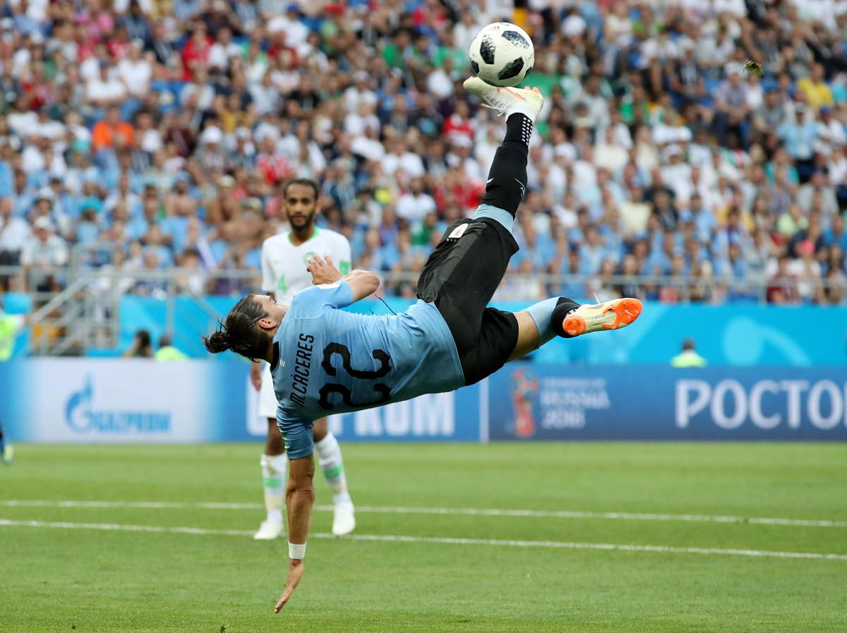 Soccer Football - World Cup - Group A - Uruguay vs Saudi Arabia - Rostov Arena, Rostov-on-Don, Russia - June 20, 2018 Uruguay's Martin Caceres shoots at goal with an overhead kick REUTERS/Marko Djurica