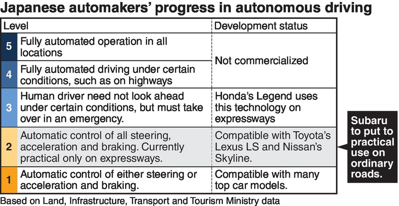 Self-driving car technology works better in the controlled environment of a limited-access expressway than in the more unpredictable environment of an ordinary open street. But in the late 2020s, Subaru Corp. aims to sell cars that can use an advanced type of so-called Level 2 technology on ordinary roads, The Yomiuri Shimbun has learned.