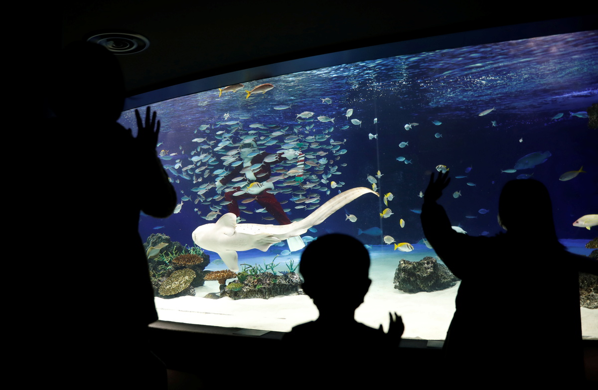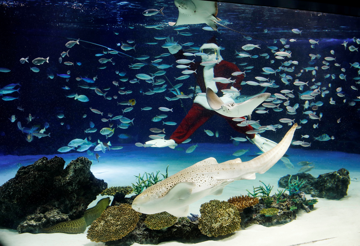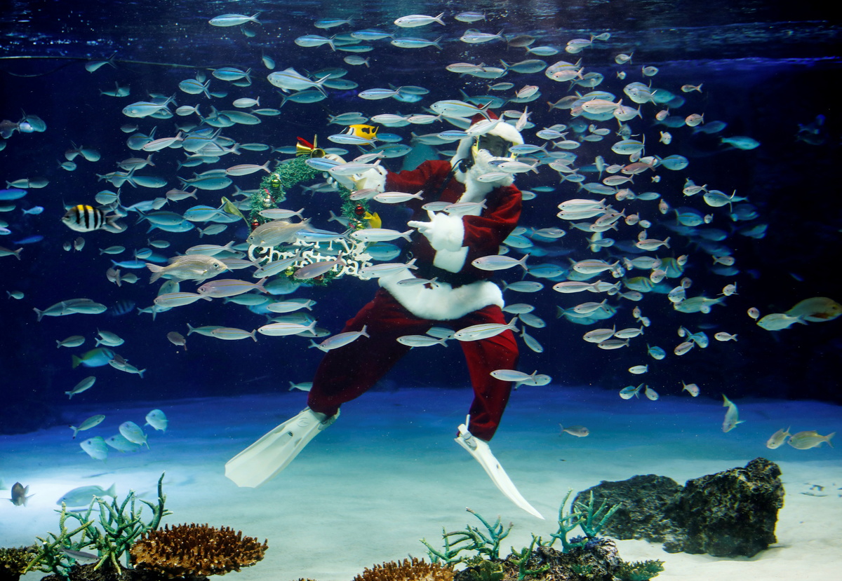 Dressed in a Santa Claus costume, a mask and flippers, a diver waved through a curtain of tropical fish in a Tokyo aquarium at socially distanced spectators watching from behind glass.