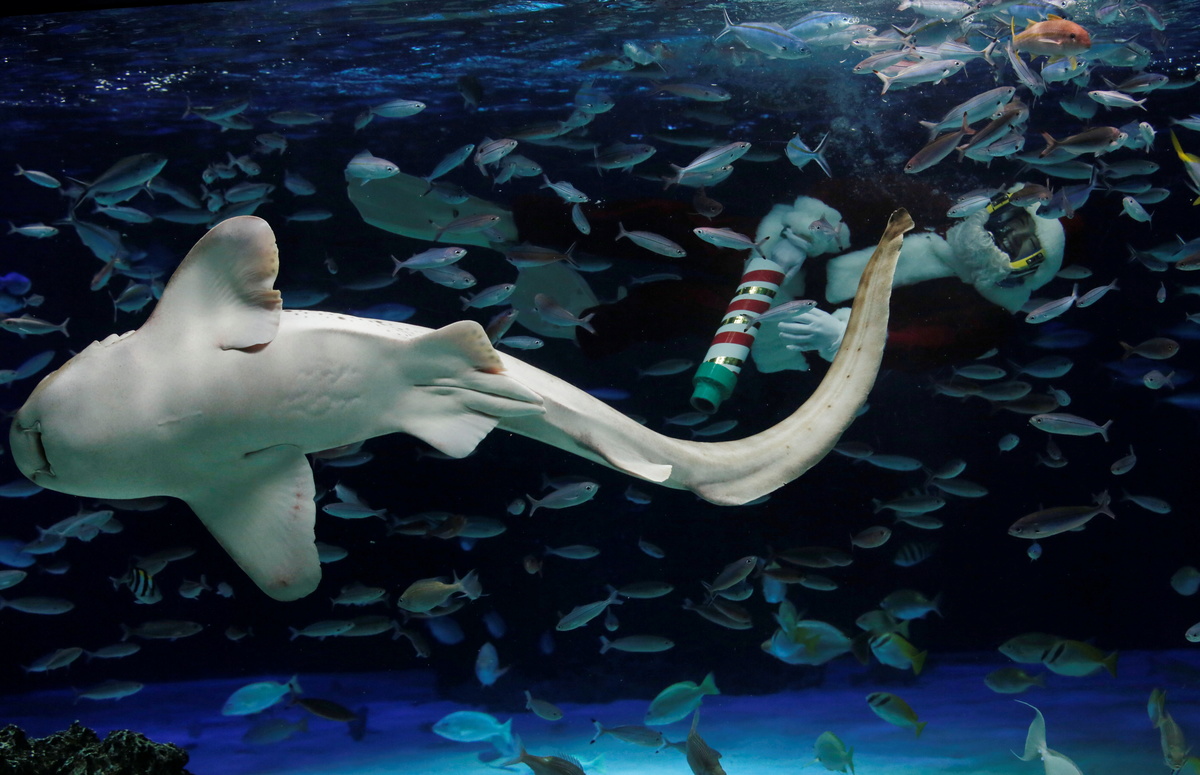 Continuing a more-than 20-year-old tradition at the Sunshine Aquarium, she held a Christmas wreath aloft as banana fish and a stingray swam by unperturbed, and used a bazooka-shaped feeder to shoot out pellets for them to feast on.