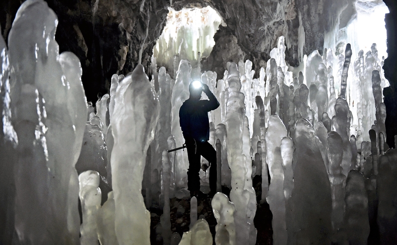 Icy stalagmites shine with reflected light inside the former Shojingawa Mine in Nanae, Hokkaido. More than 10,000 stalagmites -- some having reached heights of over 2 meters -- are growing underground there. Experts say stable winter temperatures inside the pit make falling drops of water form the ice towers, rather than icicles hanging on the ceiling.
