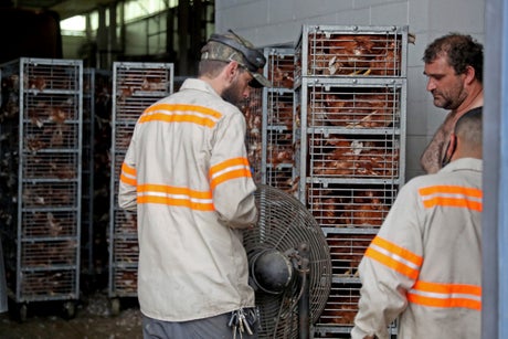 Loucks unloaded the chickens into the repair shop and two large fans were then used to help cool the birds.
