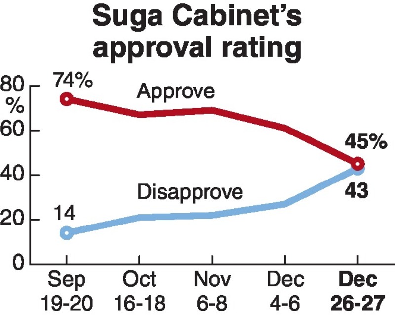 The approval rating for Prime Minister Yoshihide Suga's Cabinet fell to 45% in a nationwide poll conducted by The Yomiuri Shimbun on Dec. 26-27, down 16 points from 61% in the previous poll conducted Dec. 4-6.