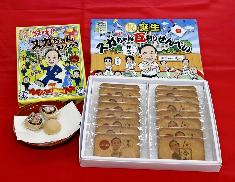 Daito Co., based in Arakawa Ward, Tokyo, which makes snacks featuring politicians, is producing and selling "Suga-chan kawara-wari sembei" (Suga's roof-tile breaking rice cracker). The packaging and the sembei itself depict Suga, who did karate in his youth, striking a pose of thrusting his fist forward and shouting "Ossu!"