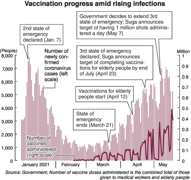 Vaccinations stood at 190,000 shots a day -- combining those given to elderly people and medical service workers -- on April 23. On that day in May, however, the number of shots a day had doubled in about four weeks. Declaring that vaccinations for the elderly will be complete by the end of July, setting a target to administer 1 million shots of vaccinations a day, and starting mass vaccinations in Tokyo and Osaka. With these three targets set up despite objections from Cabinet members and bureaucrats, vaccinations were thought to accelerate at once. Suga's smile reflected his expectation of a positive result from these measures and his confidence in them.