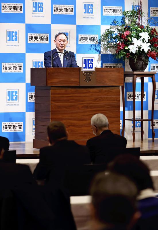 Prime Minister Yoshihide Suga pushed his ideas for using decarbonization and digitalization as the engine for putting the economy on a growth trajectory in a speech at the Yomiuri International Economic Society (YIES) on Tuesday.