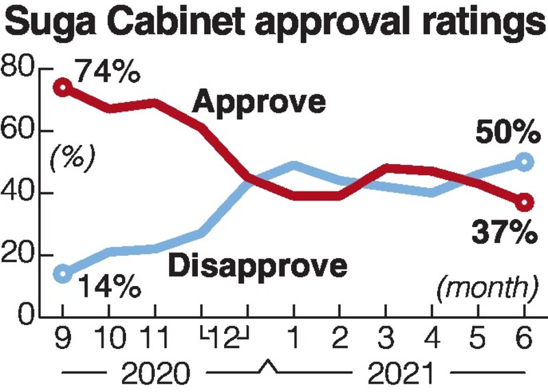 Immediately after Suga assumed office last September, his newly installed Cabinet enjoyed the support of 74% of Japanese voters, the third-highest approval rating on record. Nine months into his administration, that number fell to half. The latest poll numbers are the lowest for a Cabinet since the 37% seen last August, in the days leading up to Shinzo Abe's announcement that he would step down as prime minister.