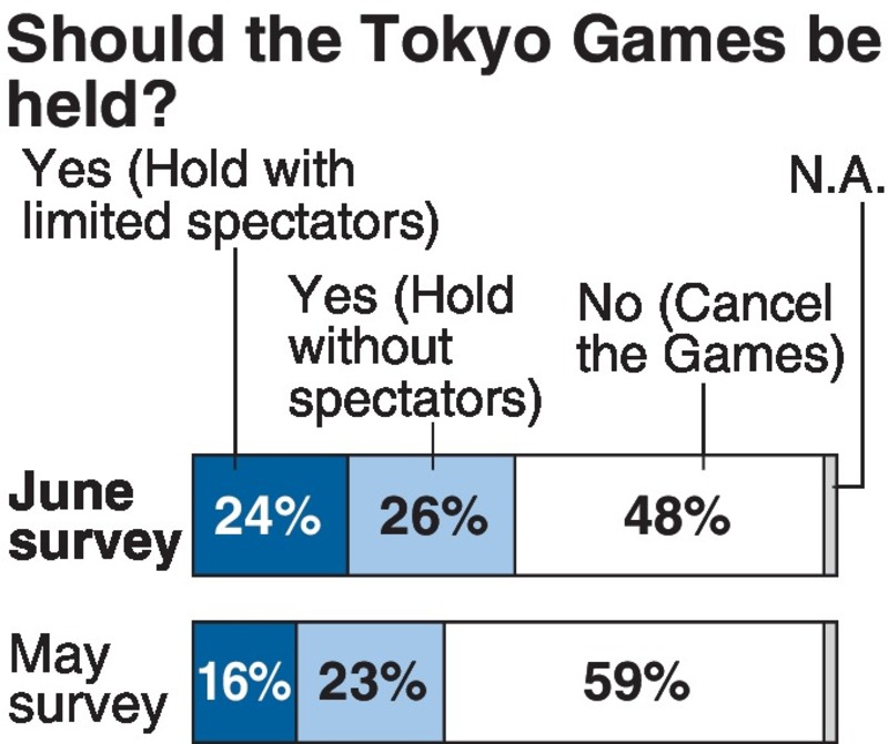 As for the Tokyo Olympics and Paralympics, 50% said they were in favor of holding the Games and 48% -- down 11 points from the previous May survey -- were in favor of cancellation.